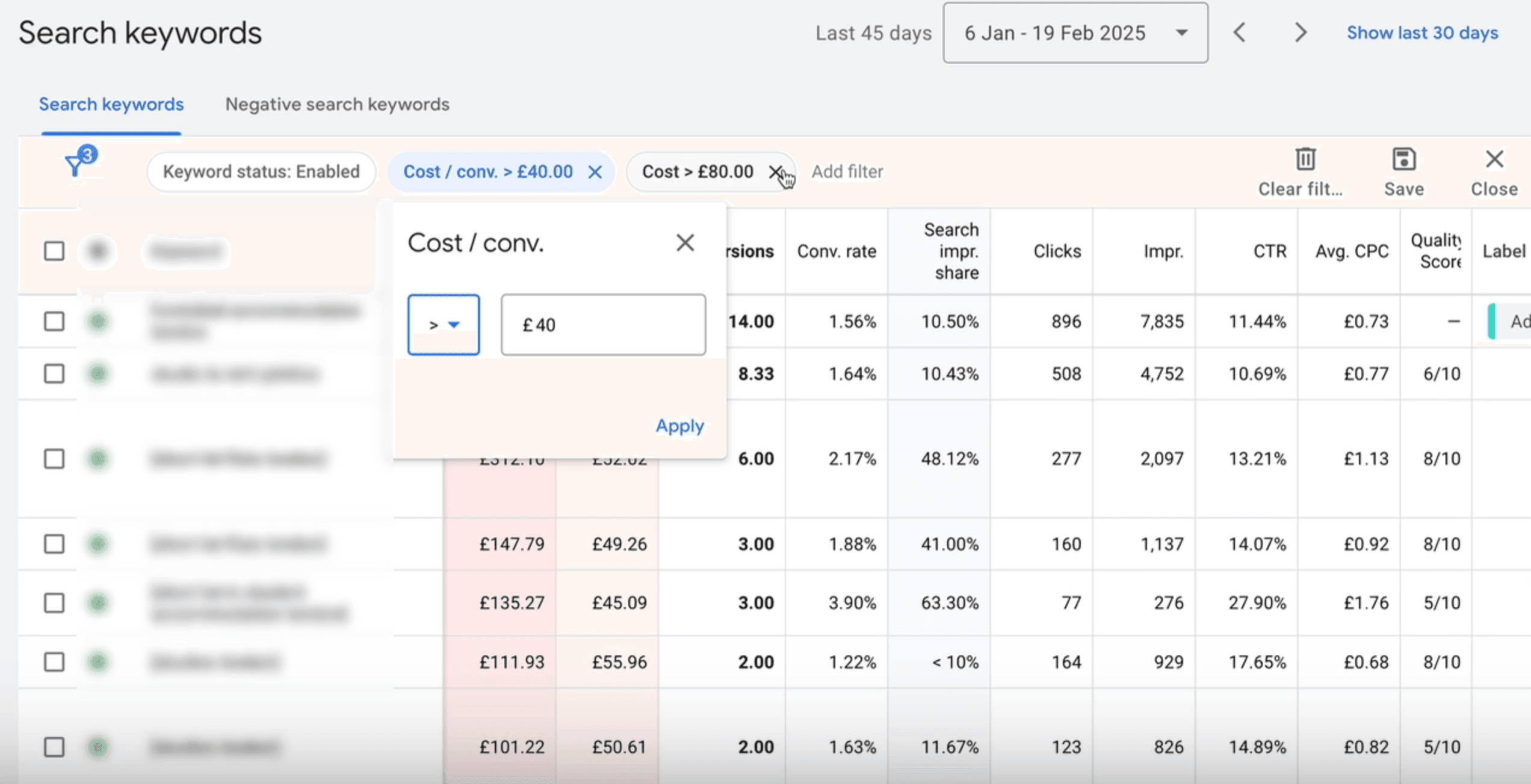 Here's a simple tip. something I do all the time - save these filter combinations with clear names like "High CPA & Spend" or "Low Impression Share low CPA." This way, you can quickly view and check them every time your optimise your account without having to think and set everything up again.